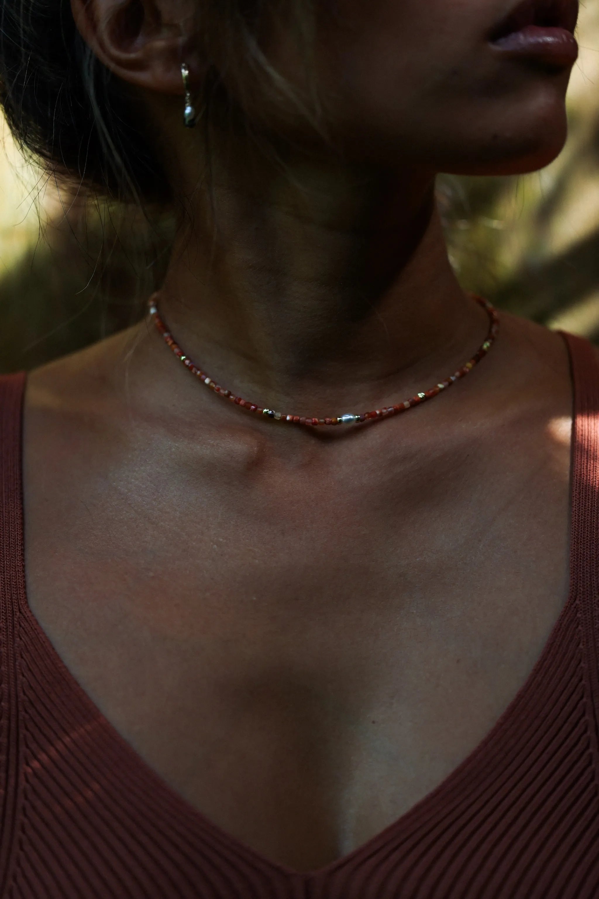 Le feu sacré: "DAHANA", en Sanskrit, dont le nom évoque la chaleur et l’intensité, est un ras-de-cou vibrant, aux nuances envoûtantes de rouge et d'orange.