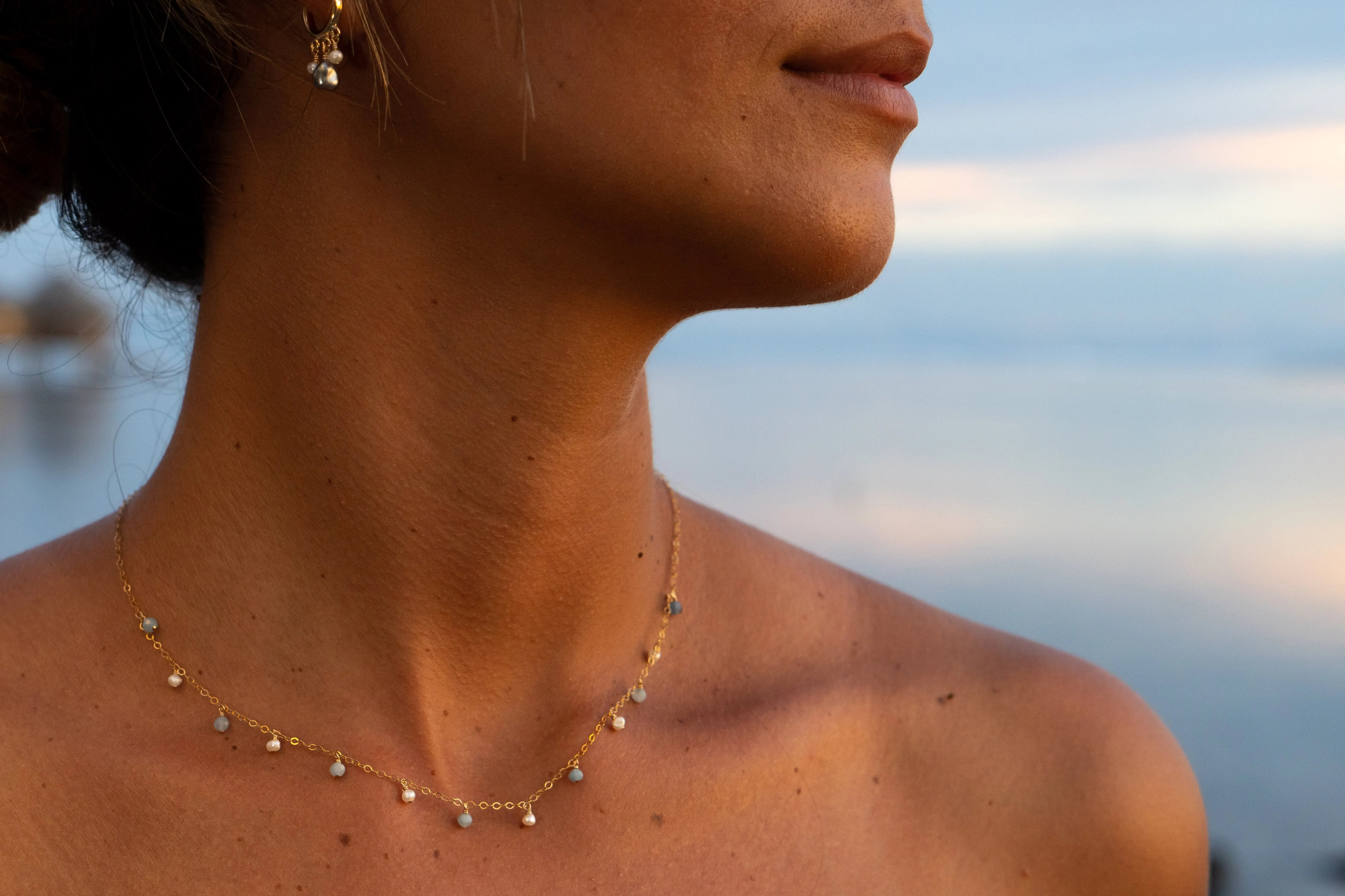 Le collier NANIHI est une création inspirée, composé d’une chaîne en gold filled (ou en acier chirurgical 316 doré selon les maillons)de sept pierres naturelles semi-précieuses d’aigue-marine bleue pale et de six délicates perles d'eau douce montées façon breloque.