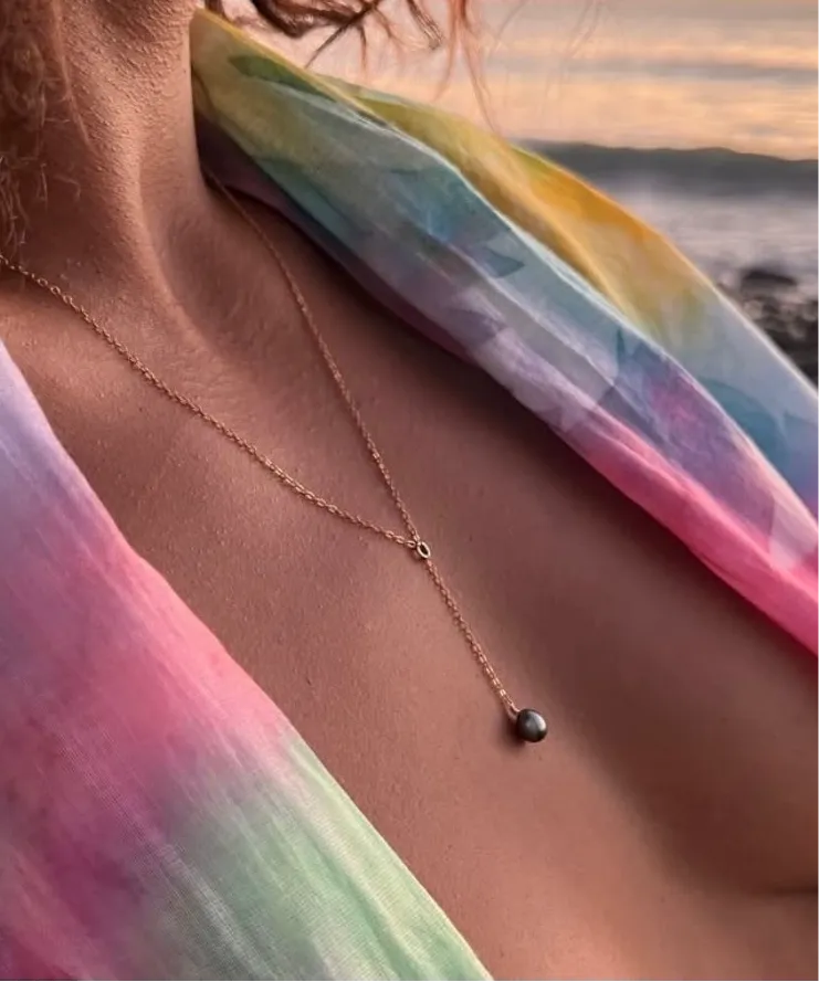 Comme une goutte de lumière née dans les lagons, ce collier doré est épuré et élégant.
